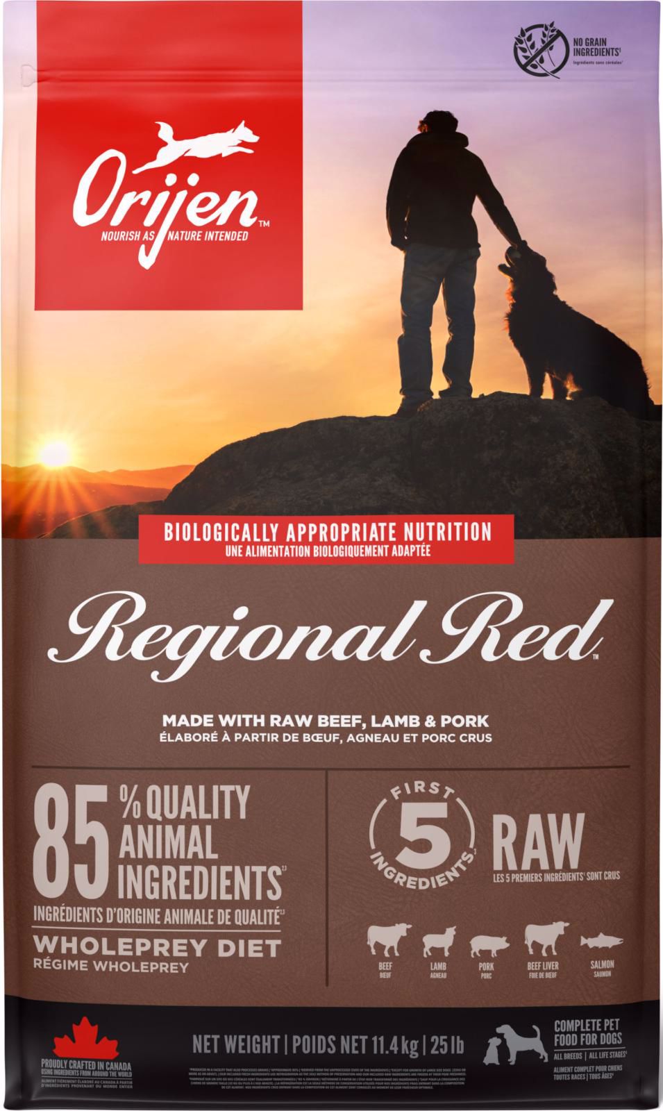 Råt oksekød (18,5%), råt lam (7%), råt svinekød (7%), rå okselever (5%), rå laks (5%), rå svinelever (5%), friske æg (5%), dehydreret lam (5%), dehydreret oksekød (5%), dehydreret sild (5%), hele røde linser, hele pintobønner, dehydreret svinekød (3,5%), dehydreret sardin (3,5%), hele grønne linser, hele kikærter, hele marinebønner, linsefedt (2%), hvid olie (3%), kikærter (2%), kikærter (3%), linsebryst, oksefedt (2%), hvidkålsolie (2%), rå lammelever (1,5%), rå oksekødsnyrer (1,5%), rå oksepelse (1,5%), rå oksekødsindmad (1.5%), rå lammenyre (1%), rå lammetarme (1%), tørret tang, friske hele græskar, friske hele butternutsquash, friske hele zucchini, friske hele gulerødder, friske hele æbler, friske hele pærer, tørret cikorierod, frisk grønkål, frisk spinat, frisk rødbedegrønt, frisk majroe, hele tranebær, hele blåbær, hele saskatoonbær, gurkemeje, marietidsel, burrerod, lavendel, althearod, hyben.