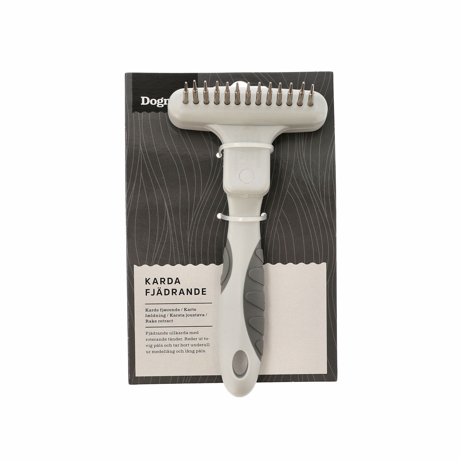 Udreder filtret pels og fjerner underuld fra mellemlang og lang pels. De 13 fjedrende og roterende tænder giver mindre slitage på pelsen og er blødere mod hundens hud end med faste tænder.